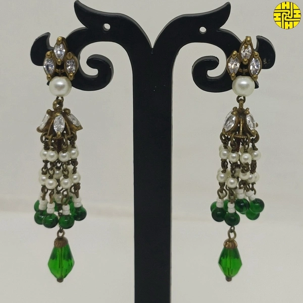 Introducing the stunningly unique Designer Long Pearl Earrings - EC-321gn from HJ, a brand renowned for its commitment to elegance and quality. Each piece of jewellery from HJ is designed to stand out, and these earrings are no exception. With a raw finish that highlights the natural brass color and its enchanting blackish hue, these earrings celebrate the beauty of unadulterated materials in a sophisticated way.