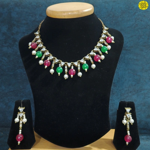 Step into a world of classic charm and colorful radiance with the Antique Raw Finish Multi Color CZ Necklace Set - Z-123ryg, brought to you by the prestigious Hasu Jewellers. This necklace set is not just an accessory; it is a testament to the timeless beauty of Kundan jewelry, reimagined with a modern twist.