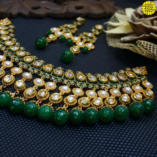 - Elegant Design: Featuring intricate Polki Kundan work, the necklace set exudes a timeless charm that complements any bridal attire.