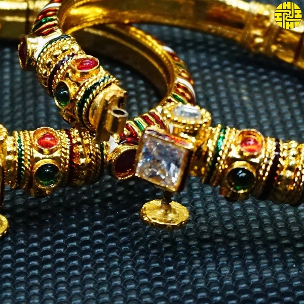 Introducing the pinnacle of sophistication and style from Hasu Jewellers — the High Gold Plating Designer Bangles Hmb 009a. Crafted with meticulous attention to detail, these bangles are a testament to the artistry and craftsmanship that HJ is renowned for. Whether you're dressing up for a special occasion or adding a touch of glamour to your everyday look, these bangles are the perfect choice.