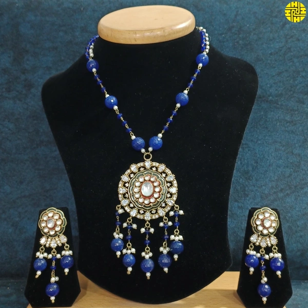 Discover Elegance with HJ's Rich Antique Raw Finish Kundan CZ Blue Pendant Set