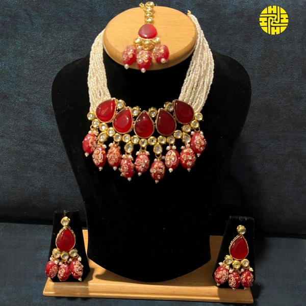 - Luxurious Design: The choker set features an intricate arrangement of Polki Kundan stones, complemented by gleaming ruby accents, creating a breathtaking visual spectacle that exudes sophistication and grandeur.