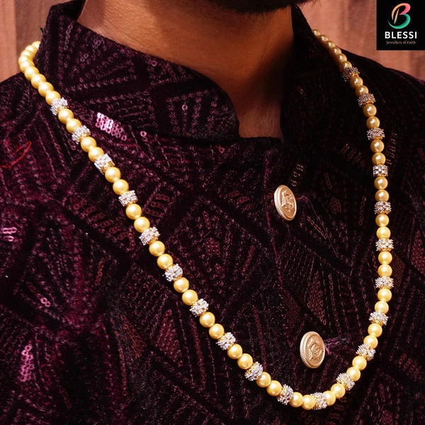 Meticulously crafted, each element of the mala shines with a careful arrangement of CZ stones that capture light brilliantly, complemented by the soft luster of pearls. The seamless integration of modern aesthetics with traditional design not only enhances the groom's attire but also adds a symbolic touch of heritage and sophistication.