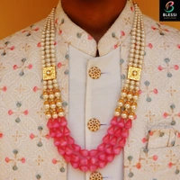 Introducing the Royal Look Three Line Pearl and Monalisa Beads Pink Mala for Grooms - Bm-005a, a masterpiece meticulously crafted by Blessi, renowned for its commitment to tradition and quality. This exquisite groom mala is a perfect blend of grandeur and grace, designed to add a regal touch to your wedding attire.
