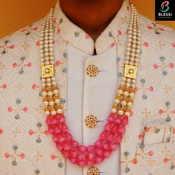 Discover Royal Elegance with the Royal Look Three Line Pearl and Monalisa Beads Pink Mala for Grooms - Bm-005a